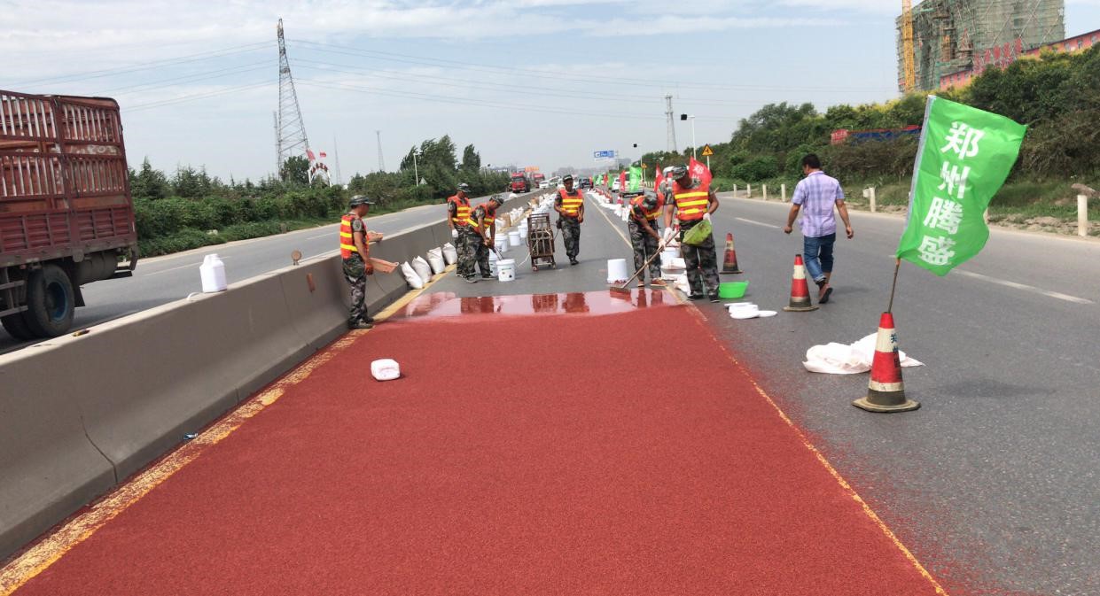 彩色防滑路面作為高等級(jí)公路標(biāo)準(zhǔn),因其造價(jià)高昂,施工技術(shù)難度大,一度成為廣泛鋪設(shè)的難點(diǎn)。其中所包含的耐候性、耐磨性與厚度控制更是令許多施工單位望而卻步。G107國(guó)道是鄭州市南部通行要道,車(chē)流量大,尤其大型車(chē)輛居多,這就使施工難度更是難上加難。經(jīng)過(guò)不懈的多方調(diào)研考察,在充分觀摩了已施工的多項(xiàng)彩色路面工程后,結(jié)合我市氣候特征與道路實(shí)際情況,我公司編制出了適合G107道路的彩色路面施工組織設(shè)計(jì),于近日正式啟動(dòng)彩色路面施工。