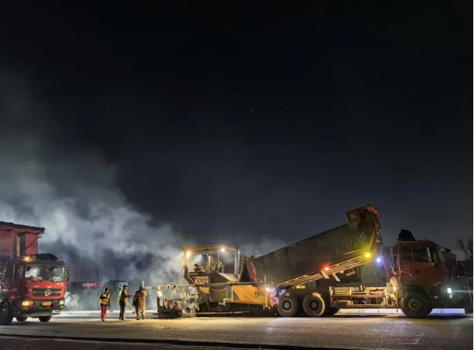 1月15日深夜,國(guó)道107線東移開封境(炎黃大道至許昌交界)新建工程的施工現(xiàn)場(chǎng)依舊燈火通明,一片繁忙的景象。大型攤鋪機(jī)有序地將滾燙的瀝青混合料均勻鋪展,壓路機(jī)往返穿梭,有條不紊地將路面壓實(shí)整平。在這寒意逼人的冬夜里,機(jī)械的轟鳴聲,施工人員忙碌的身影以及耀眼燈光相互交織,奏響了一曲勞動(dòng)者的“奮斗之歌”。